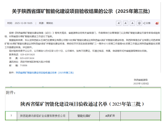 近日,陕西省能源局公布了关于陕西省煤矿智能化建设项目验收结果的公示(2025年第三批),BEVITOR·伟德国际冯家塔矿业运营有限责任公司位列其中。