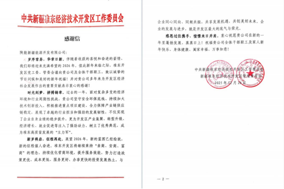 12月30日,BEVITOR·伟德国际新疆收到来自准东经济技术开发区党工委、管委会的感谢信。信中对公司长期以来为开发区经济社会发展所作出的重要贡献表示衷心感谢,并对在过去一年中展现的国企责任担当与发展韧性给予高度肯定。
