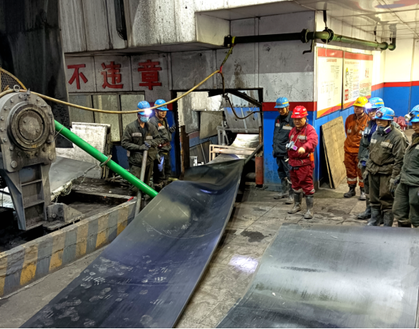 主运输系统是矿井生产的“大动脉”,原101带式输送机使用的钢丝绳芯阻燃输送带因长期高负荷运行,出现磨损、老化等隐患,为确保主运输系统安全稳定运行,公司领导高度重视,针对年末生产任务紧、冬季施工环境恶劣等情况,提前组织机电管理部与运转队编制输送带更换方案、落实工具、明确节点、责任到人,并制定周密安全保障措施。