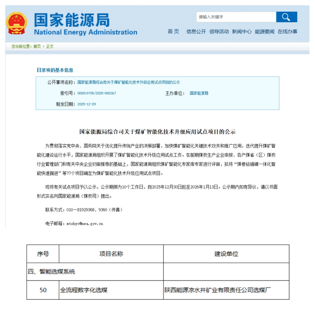 近日,国家能源局综合司公布煤矿智能化技术升级应用试点项目,凉水井矿业《全流程数字化选煤》项目成功入选,标志着公司选煤智能化建设成果获国家级认可。