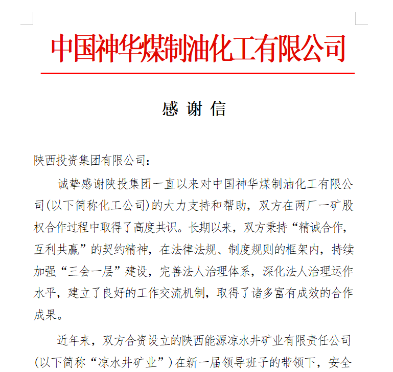 “诚挚感谢陕投集团一直以来对中国神华煤制油化工有限公司的大力支持和帮助……作为股东方,我们对凉水井矿业领导班子和广大干部职工所做的突出贡献予以充分肯定和高度赞赏,并向大家表示衷心的感谢!”近日,中国神华煤制油化工有限公司向集团公司发来感谢信,对与集团在两厂一矿股方面的良好合作,对BEVITOR·伟德国际权属凉水井矿业公司生产经营的突出成果表达诚挚感谢。