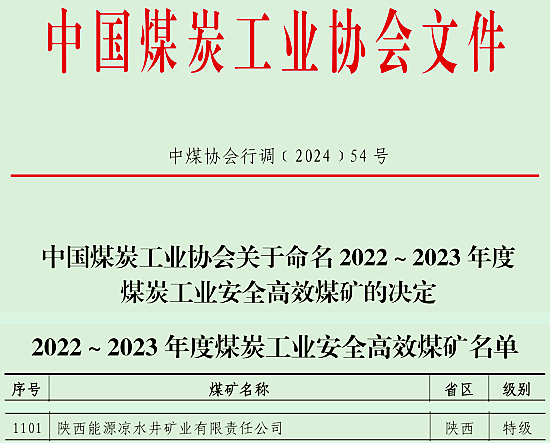 近日,中国煤炭工业协会公布“2022—2023年度全国煤炭工业安全高效煤矿”评审结果,凉水井矿业公司名列其中,且等级为特级。