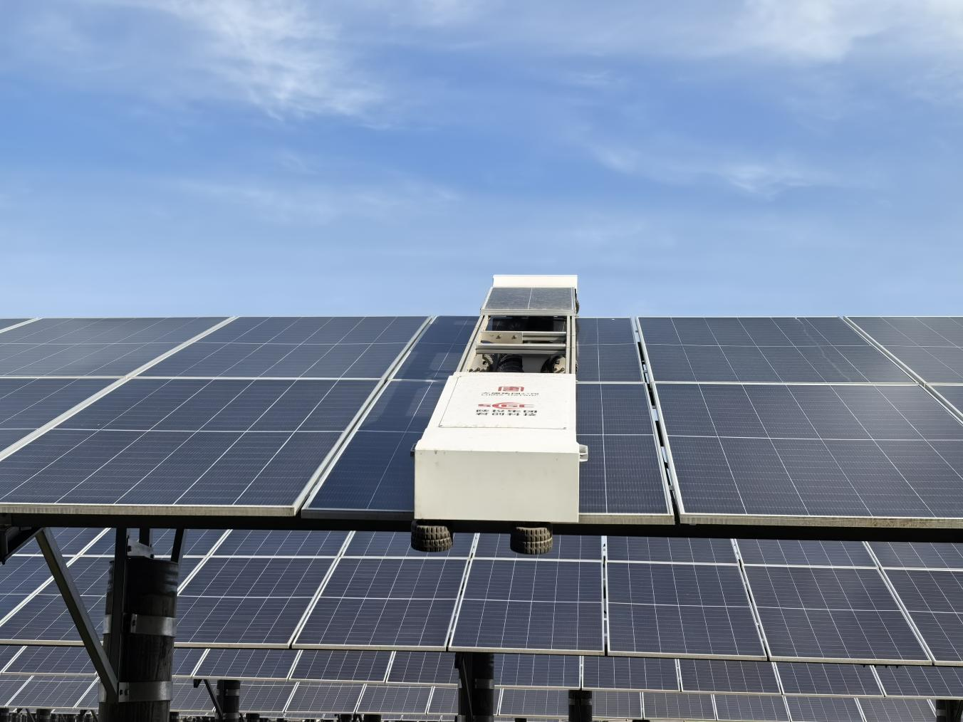运维机器人由电力运营君创科技和高校合作研发,拥有多项专利,在国内率先实现了组件间前后、高低跨越、长距离跨串、平单轴同步角度误差跨越清洁工作,提升光伏组件发电效率15%。