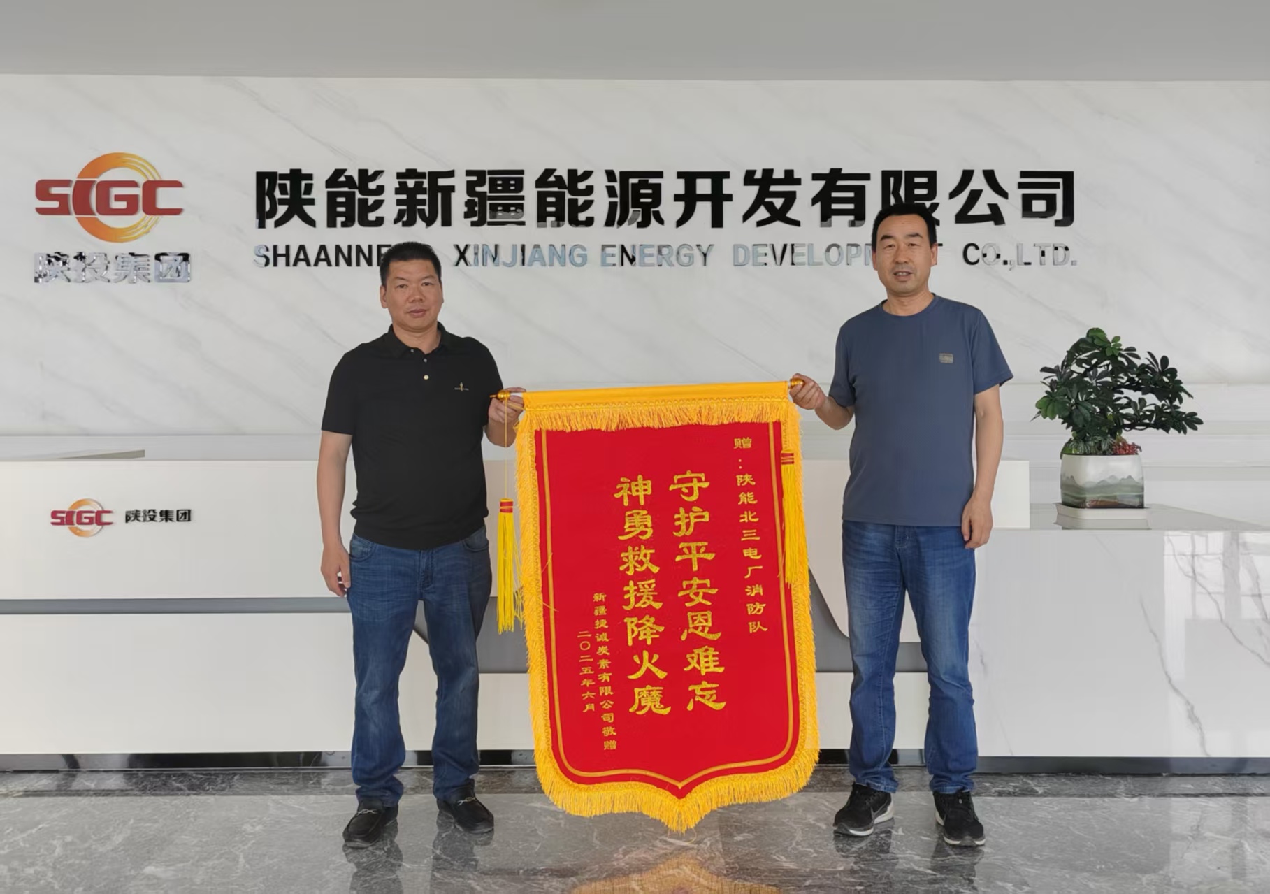 六月的准东戈壁,风裹着砂砾掠过龟裂的盐碱地,将热浪揉进每一寸干涸的土地。当那面红色金丝绒的锦旗在阳光下展开,鎏金大字“守护平安恩难忘 神勇救援降火魔”在这一刻显得熠熠生辉,仿佛将5月那场惊心动魄的烈焰都封印进这方小小的红布中。新疆捷成碳业董事长陈国权指尖摩挲着绣线,目光突然变得恍惚——厂房废墟里焦黑扭曲的梁柱、消防员们被浓烟熏得黢黑的脸庞,又在眼前鲜活起来,连空气里似乎都浮动着那场大火残留的焦灼气息。