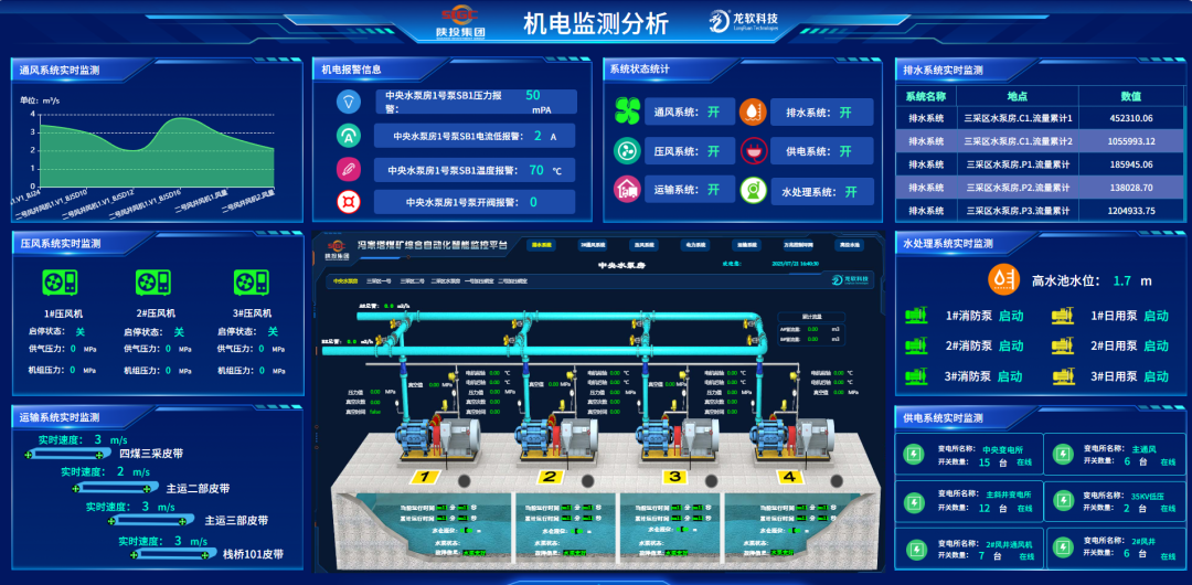 四是创新数智生产,解决生产智控联动及减员增效瓶颈。建成主煤流智能集控系统,实现AI视频监控、变频控制、多机联锁远程控制等功能,单班仅需1人便可以完成多部主运输胶带输送机的管控;建成智能通风、智能压风、智能供配电、智能供排水系统,实现关键生产环节的全面数据化监测监控,实现二号风井工业场地、井上下变电所、排水泵房和加压硐室的远程集控、无人值守、有人巡视,减少岗位工投入40余人,为公司发展带来切实可见的效益提升。