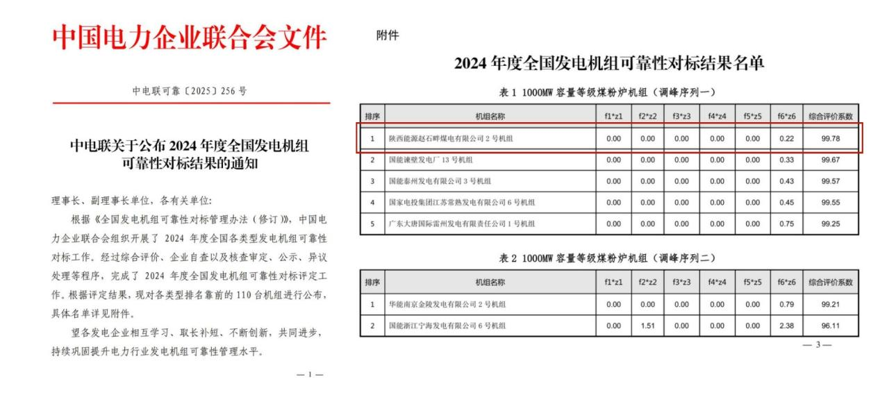 喜讯!赵石畔煤电2号机组获“全国发电 机组可靠性对标”百万机组第一名