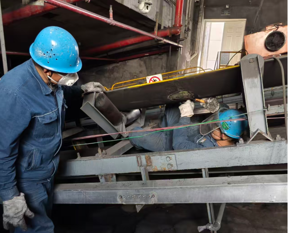 在不足半米高的皮带输送架下,输煤检修班张保亮半躺在地、蜷缩身体,在弥漫的粉尘中仔细排查每一个连接点和磨损处。他目光如炬,紧盯着每一个细节,这个看似“躺平”的姿势,恰恰是为了让这条生产的“咽喉”要道顺畅运行。